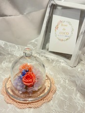 夕焼けのようなオレンジのバラが主役の、心ときめくプリザーブドフラワーアレンジ。